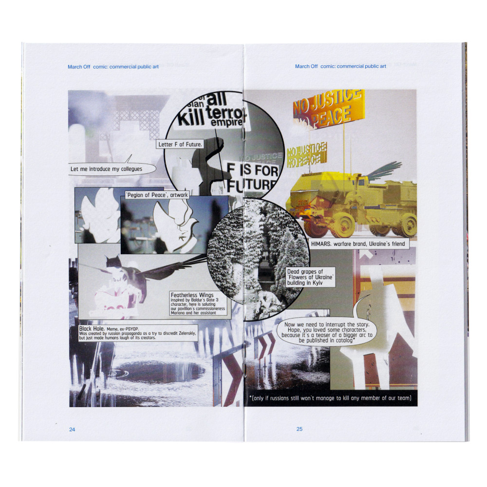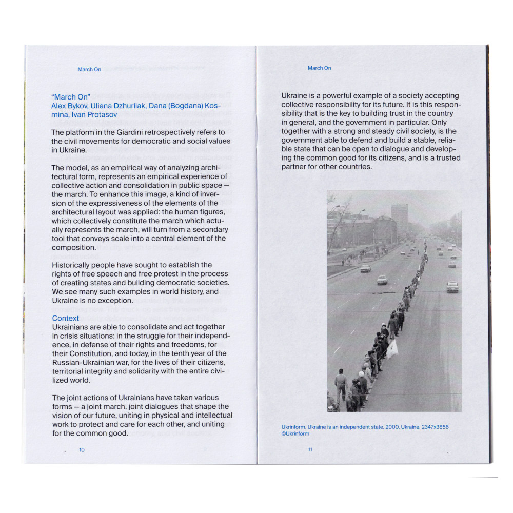 The "March On" exhibition is a polyphonic structure that works in a three-part unison: "March On", a mock-up of the democratic march in the Giardini (Alex Bykov, Bogdana Kosmina, Ivan Protasov, Uliana Dzhurliak); "March Off", a mock-up of the destruction / rebuilding in the Arsenal (Svitlanka Konoplyova, Borys Medvedik); and the "Human Chain" video installation (Nataliia Mysak).