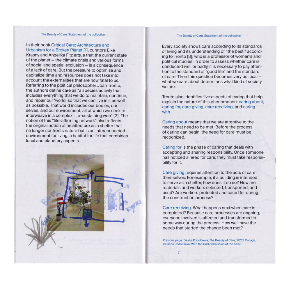 In their book Critical Care: Architecture and Urbanism for a Broken Planet [1], curators Elke Krasny and Angelika Fitz argue that the current state of the planet — the climate crisis and various forms of social and spatial exclusion — is a consequence of a lack of care. But the pressure to optimize and capitalize time and resources does not take into account the externalities that are now fatal to us. Referring to the political philosopher Joan Tronto, the authors define care as “a species activity that includes everything that we do to maintain, continue, and repair our 'world' so that we can live in it as well as possible. That world includes our bodies, our selves, and our environment, all of which we seek to interweave in a complex, life-sustaining web” [2]. The notion of this “life-affirming network” also reflects the original notion of architecture as a shelter that no longer confronts nature but is an interconnected environment for living; a habitat for life that combines local and planetary aspects.