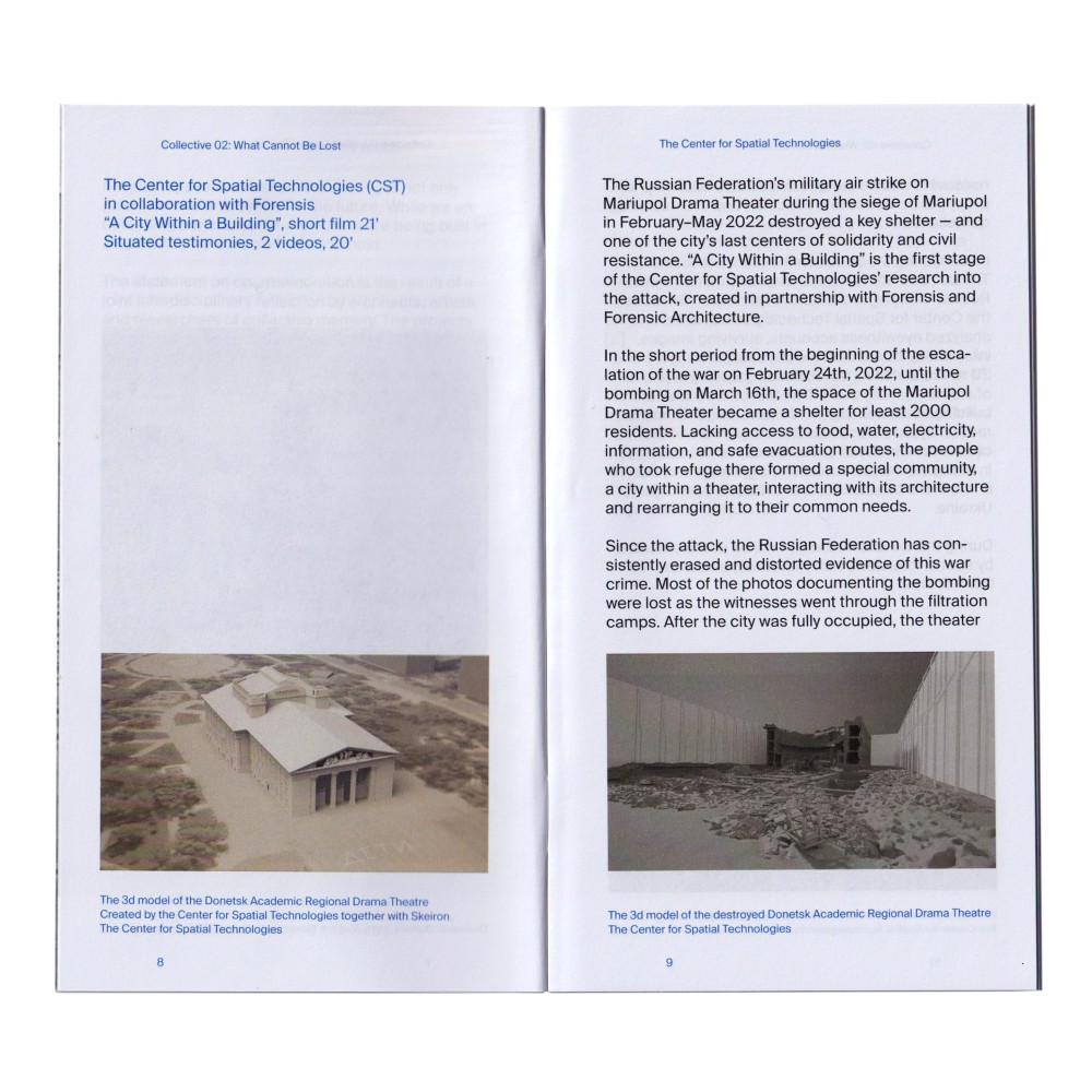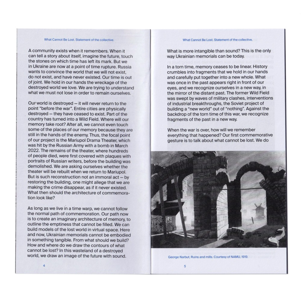 As long as we live in a time warp, we cannot follow the normal path of commemoration. Our path now is to create an imaginary architecture of memory, to outline the emptiness that cannot be filled. We can build models of the lost world in virtual space. Here and now, Ukrainian memorials cannot be embodied in something tangible. From what should we build? How and where do we draw the contours of what cannot be lost? In this wasteland of a destroyed world, we draw an image of the future with sound. What is more intangible than sound? This is the only way Ukrainian memorials can be today.